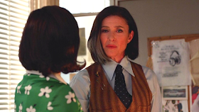 And then there is Megan, who was treated like a whore by pretty much everyone in this episode. To some degree, I think Weiner and company are trying to get us to think about actresses as whores in general, a metaphor that certainly isn't unique to Mad Men. In order to move her career forward, Megan has to do what so many actresses do in her position: butter up, seduce, and play to those in power (and because we're in the 1970s--that means a man). In this case, Harry Crane, someone Megan cannot stand even in the slightest but for whom she'll put on her best mini-dress, poof up her hair, and put on tons of eyeshadow (holy blue eyeshadow, Batman!). She'll play up the fact that she's a gorgeous woman while flattering the heck out of her lunch companion if it means Harry will help her get an agent. Now, make no mistake, I am not making excuses for Harry Crane who takes the women-as-whores thesis to a literal translation and propositions Megan at the lunch table. He's a pig and he deserved a good slap in the face or even just a glass of wine thrown in his face. But he's demonstrating the concept of this episode: men have the power to turn women in whores and, more than that, it's expected. All art is selling something, and if Megan wants to be an artist, then she has to sell something--namely herself. Harry's entire bit of advice to Megan after she rejects his sexual advances is that if Megan didn't act this way, she'd be further in her career. Whore it out, baby! That's how you'll get far in this world. After the nasty run in with Harry Crane, Megan is then treated to yet another display of women-are-whores and this time from her former husband, Mr. Draper himself. After hearing about how Don has ruined Megan's life, Don decides that the only way to make up for this is to treat Megan like...you guessed it. A whore. He literally pulls out his check book and gives her a million dollars. In Don's head, he's hoping that this makes Megan happy and that's righted the wrongs he committed because surely women want things like money and presents (never respect or admiration or an apology), but coming off of Megan's lunch with Harry in which she was asked for sex in return for help in her career...this was just another way of reminding her that she's a whore. Way to go Don!